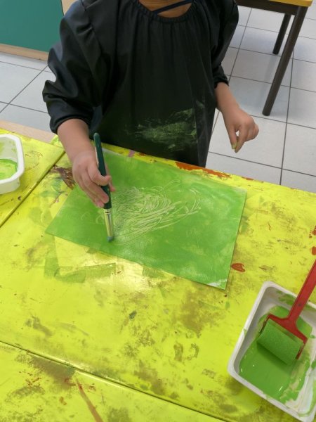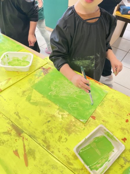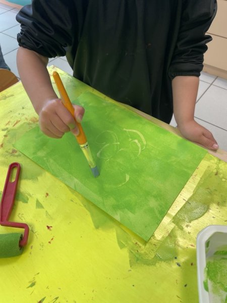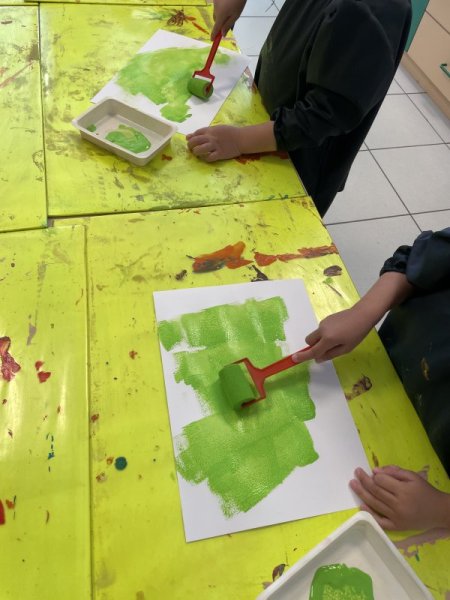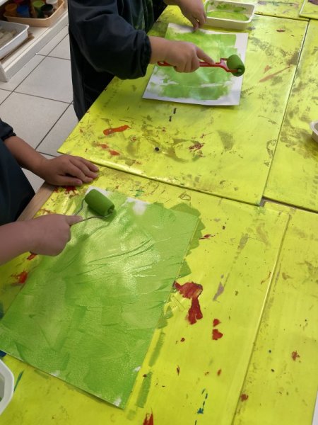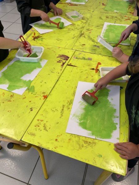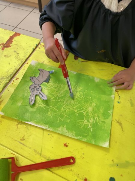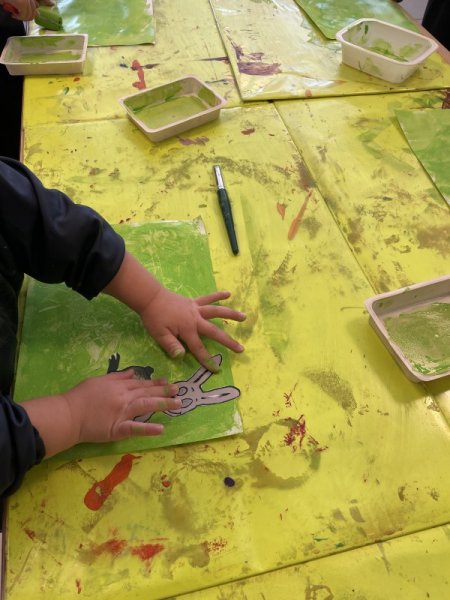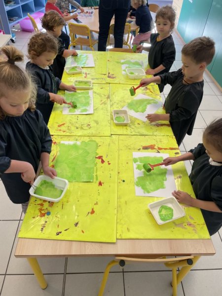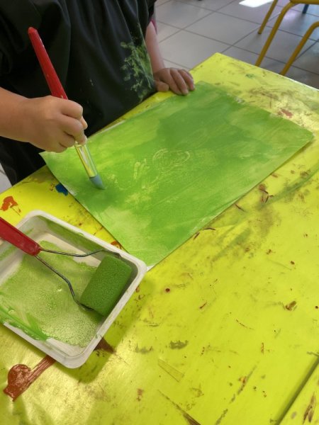 Pendant le temps d’arts visuels, les enfants ont créé la page du VERT en roulant le rouleau de peinture. Puis, ils ont gribouillé avec le crayon traceur avant de coller le lapin aux fesses vertes.
