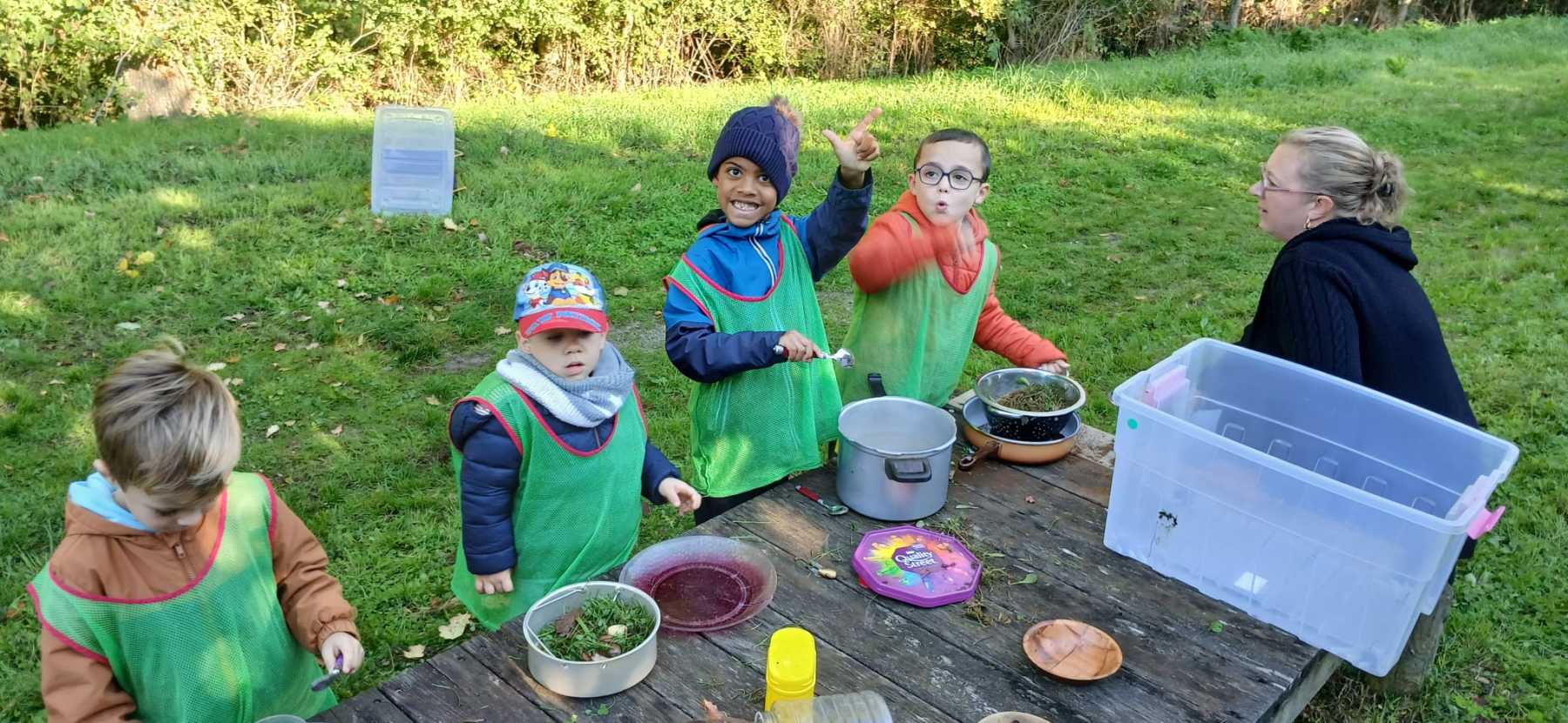 Pour cette première session d’école dehors, le thème était d’apprendre à se connaître et vivre un moment en groupe tous niveaux confondus (de la PS au CP).
