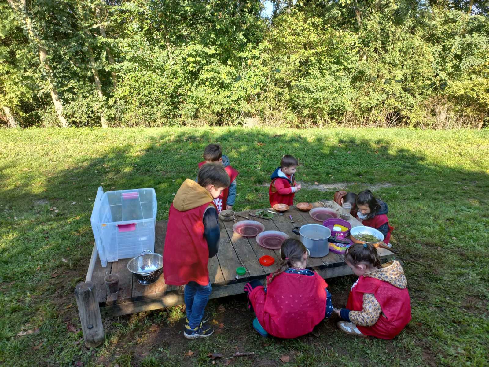Pour cette première session d’école dehors, le thème était d’apprendre à se connaître et vivre un moment en groupe tous niveaux confondus (de la PS au CP).