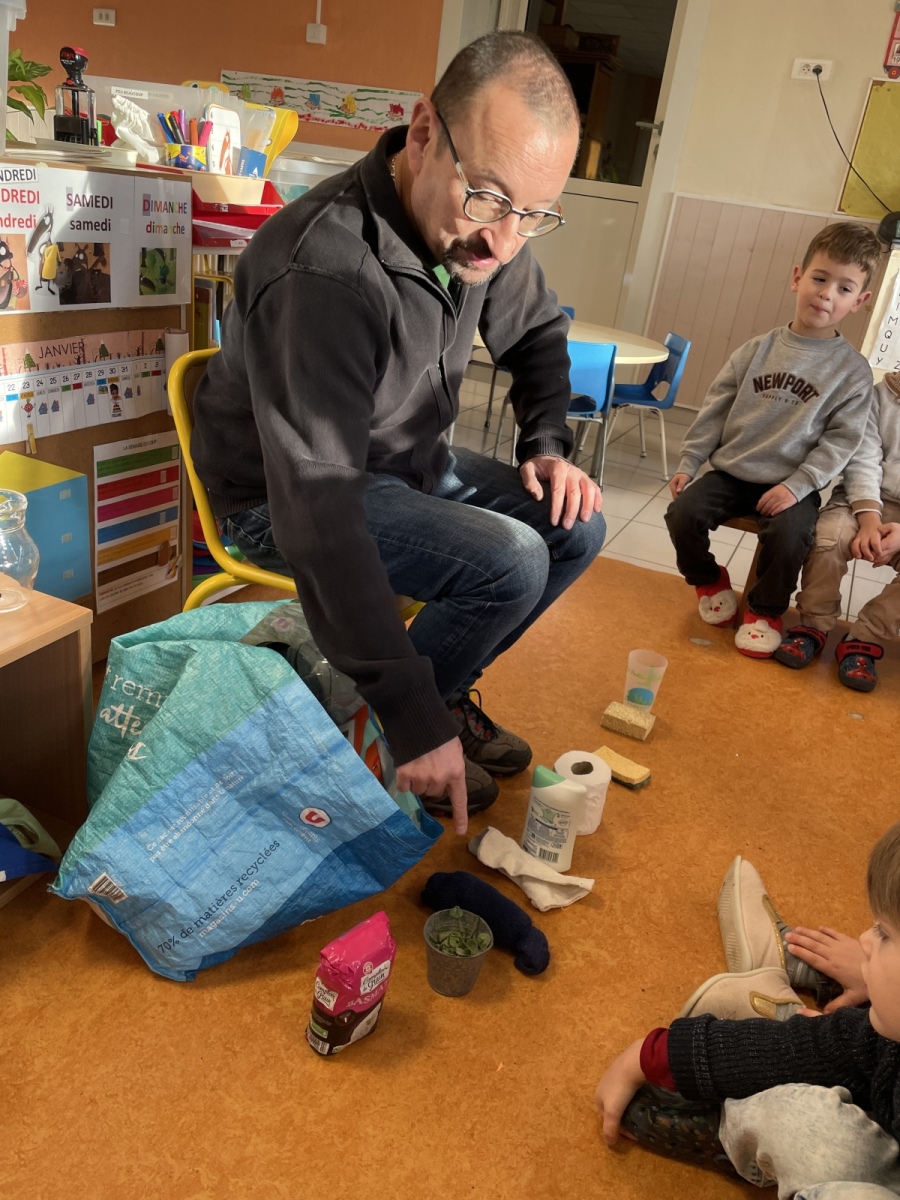 Les élèves de TPS PS MS ont profité de leur seconde séance avec François-Xavier et Ecopousse. Cette séance était dédiée à l’eau. Tout d’abord, les enfants ont évoqué avec François-Xavier les différents usages de l’eau dans la maison : pour se laver, pour boire et en cuisine, pour laver le linge, la vaisselle, pour arroser les plantes. Ensuite, ils ont joué aux cartes. Il fallait rechercher les cartes où on utilise de l’eau dans la maison, puis rechercher celles ou on gaspille l’eau. Après un bilan collectif de ces jeux, tous ont participé à une expérience : vérifier quelles quantités d’eau sont utilisées pour se laver les mains (soit en fermant le robinet ou en laissant couler pendant le lavage.) Le résultat était sans appel. Ce temps-fort était donc un temps de sensibilisation pour éviter le gaspillage de l’eau.