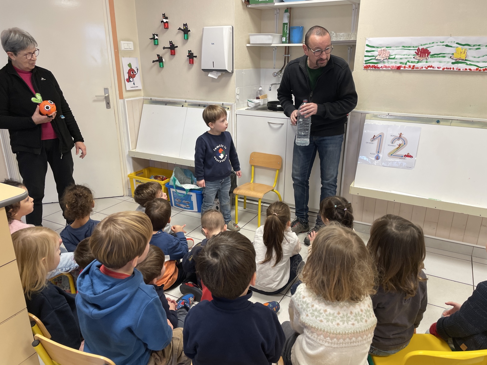 Les élèves de TPS PS MS ont profité de leur seconde séance avec François-Xavier et Ecopousse. Cette séance était dédiée à l’eau. Tout d’abord, les enfants ont évoqué avec François-Xavier les différents usages de l’eau dans la maison : pour se laver, pour boire et en cuisine, pour laver le linge, la vaisselle, pour arroser les plantes. Ensuite, ils ont joué aux cartes. Il fallait rechercher les cartes où on utilise de l’eau dans la maison, puis rechercher celles ou on gaspille l’eau. Après un bilan collectif de ces jeux, tous ont participé à une expérience : vérifier quelles quantités d’eau sont utilisées pour se laver les mains (soit en fermant le robinet ou en laissant couler pendant le lavage.) Le résultat était sans appel. Ce temps-fort était donc un temps de sensibilisation pour éviter le gaspillage de l’eau.