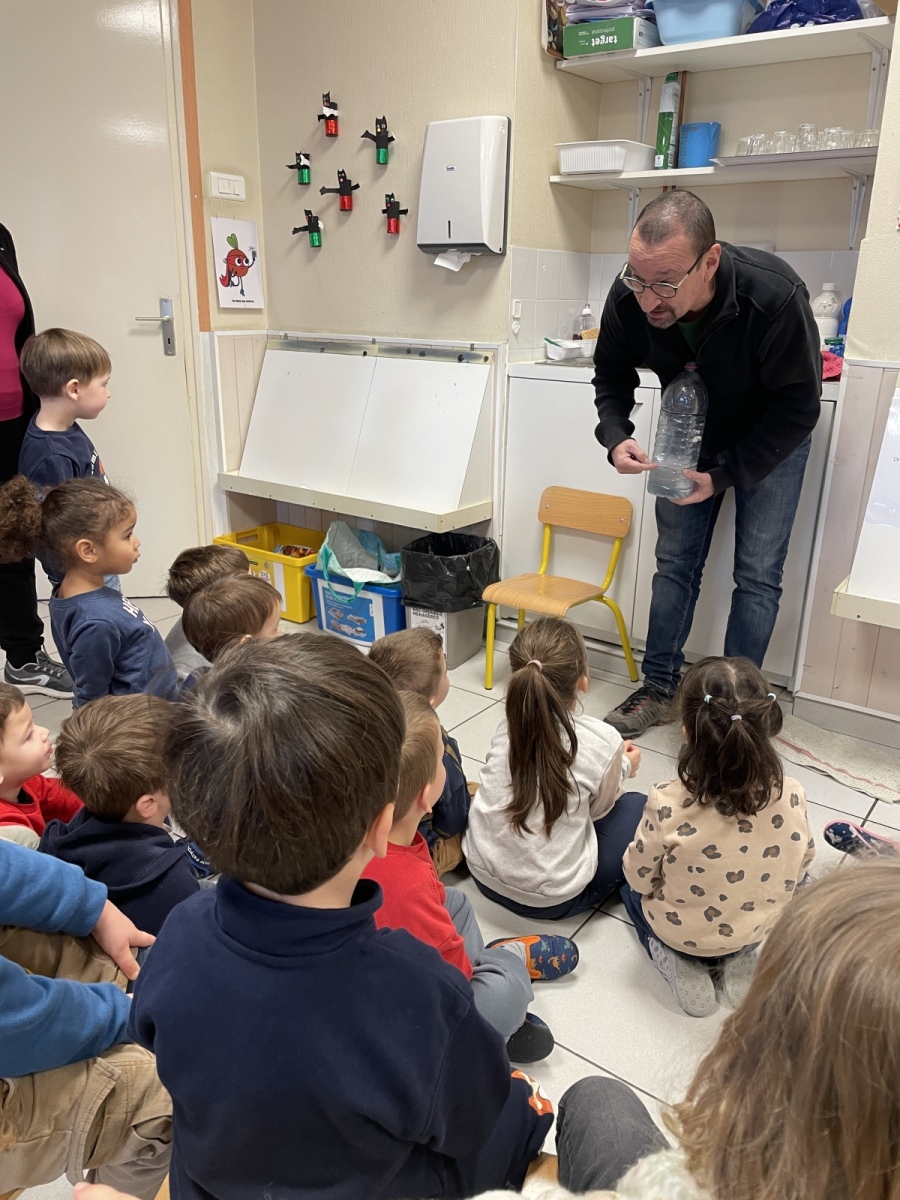 Les élèves de TPS PS MS ont profité de leur seconde séance avec François-Xavier et Ecopousse. Cette séance était dédiée à l’eau. Tout d’abord, les enfants ont évoqué avec François-Xavier les différents usages de l’eau dans la maison : pour se laver, pour boire et en cuisine, pour laver le linge, la vaisselle, pour arroser les plantes. Ensuite, ils ont joué aux cartes. Il fallait rechercher les cartes où on utilise de l’eau dans la maison, puis rechercher celles ou on gaspille l’eau. Après un bilan collectif de ces jeux, tous ont participé à une expérience : vérifier quelles quantités d’eau sont utilisées pour se laver les mains (soit en fermant le robinet ou en laissant couler pendant le lavage.) Le résultat était sans appel. Ce temps-fort était donc un temps de sensibilisation pour éviter le gaspillage de l’eau.